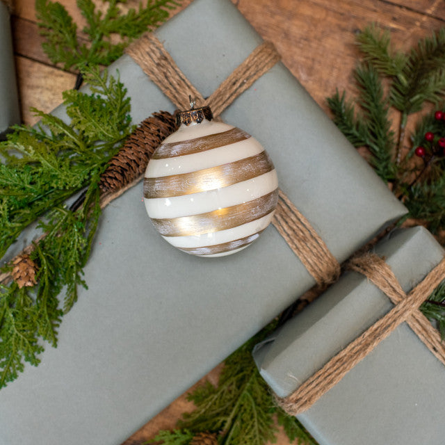 Elevate your holiday decor with our Cream and Gold Striped Bauble. This meticulously designed ornament combines timeless elegance with a touch of opulence, featuring classic cream and shimmering gold stripes. Add a touch of sophistication and warmth to your Christmas tree with this stunning bauble. Make your festive season shine with our Cream and Gold Striped Bauble, the perfect choice for a luxurious and stylish holiday ambiance.