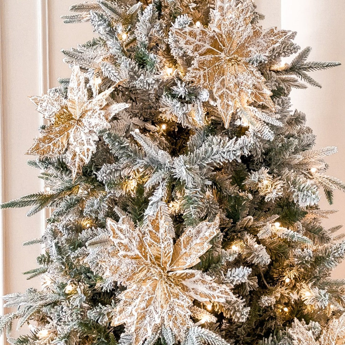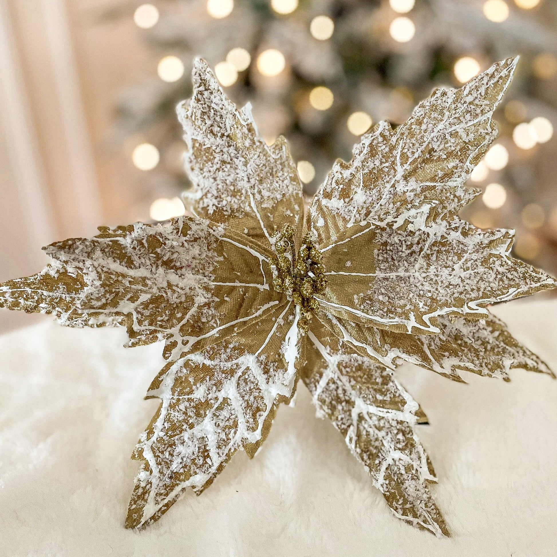Elevate your holiday decor with the enchanting beauty of our Frosted Gold Poinsettia Christmas Floral. This exquisite arrangement combines the timeless charm of poinsettias with a touch of elegance in frosted gold. Whether used as an accent piece in your garland or adding that little extra interest in your tree, these florals add a touch of opulence and sophistication to your festive ambiance.