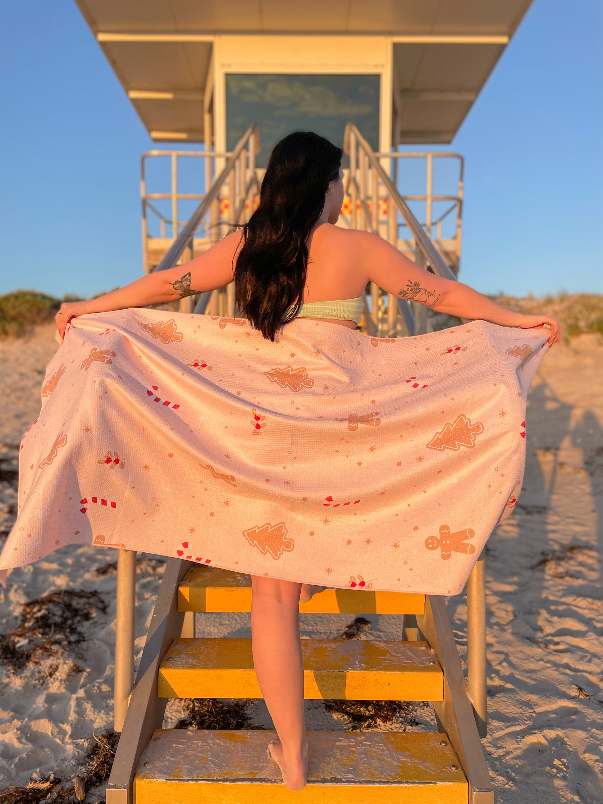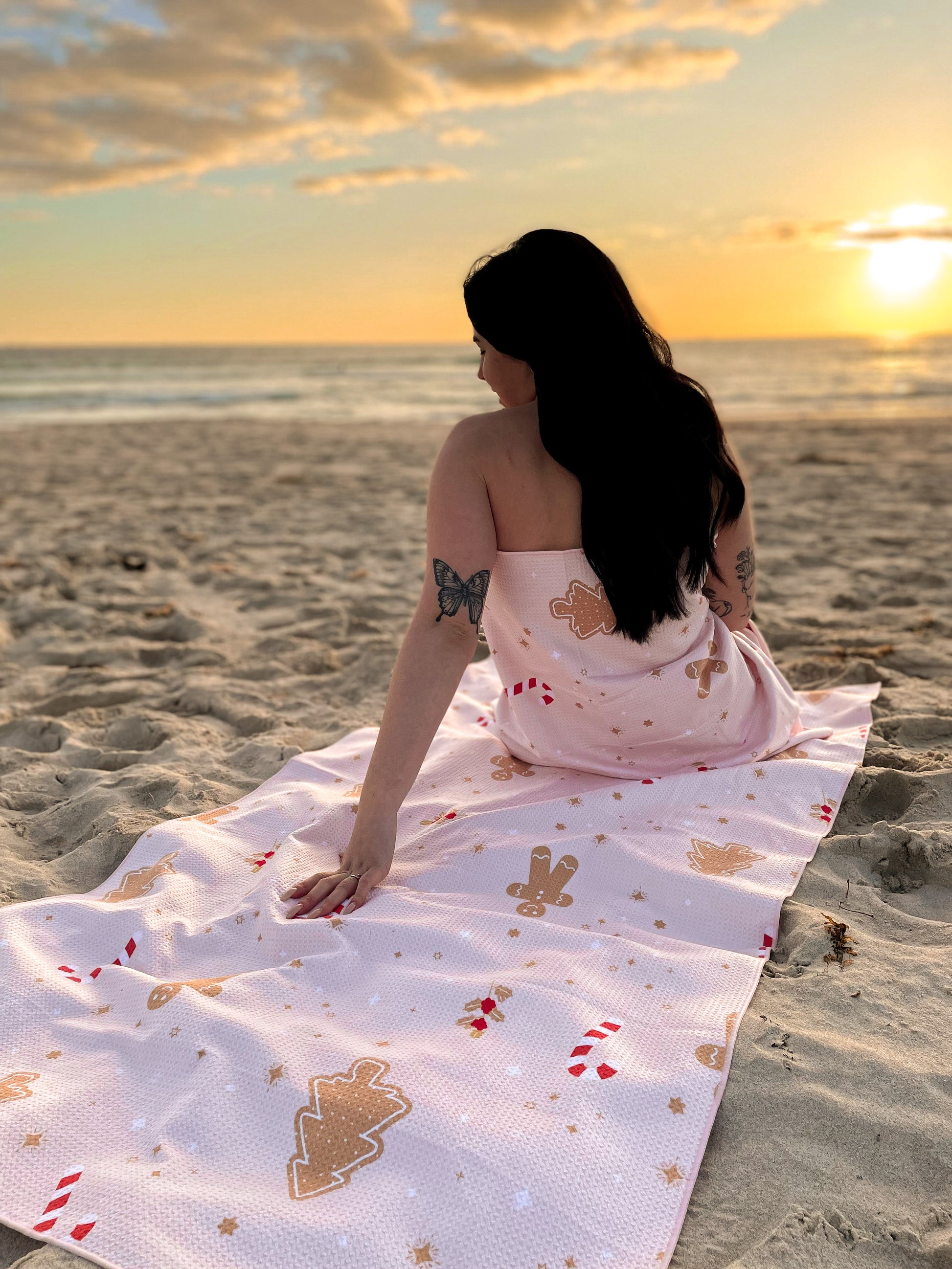 Our custom pink gingerbread towel comes with a matching draw-string storage bag, making it easy to bring with you on your summer adventures!