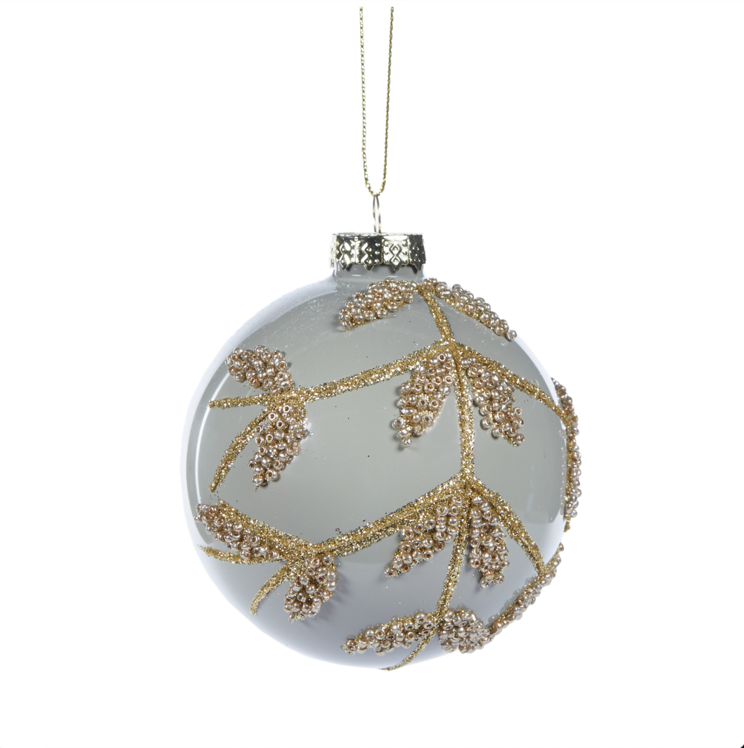This sprakly ornament captures the timeless charm of mistletoe, adorned with delicate gold beads that glisten with seasonal elegance. Hang it on your Christmas tree to infuse a touch of sophistication and tradition into your festivities. Celebrate the season with our Gold Beaded Mistletoe Bauble, a symbol of love and good fortune, and add a touch of shimmering opulence to your holiday ambiance.