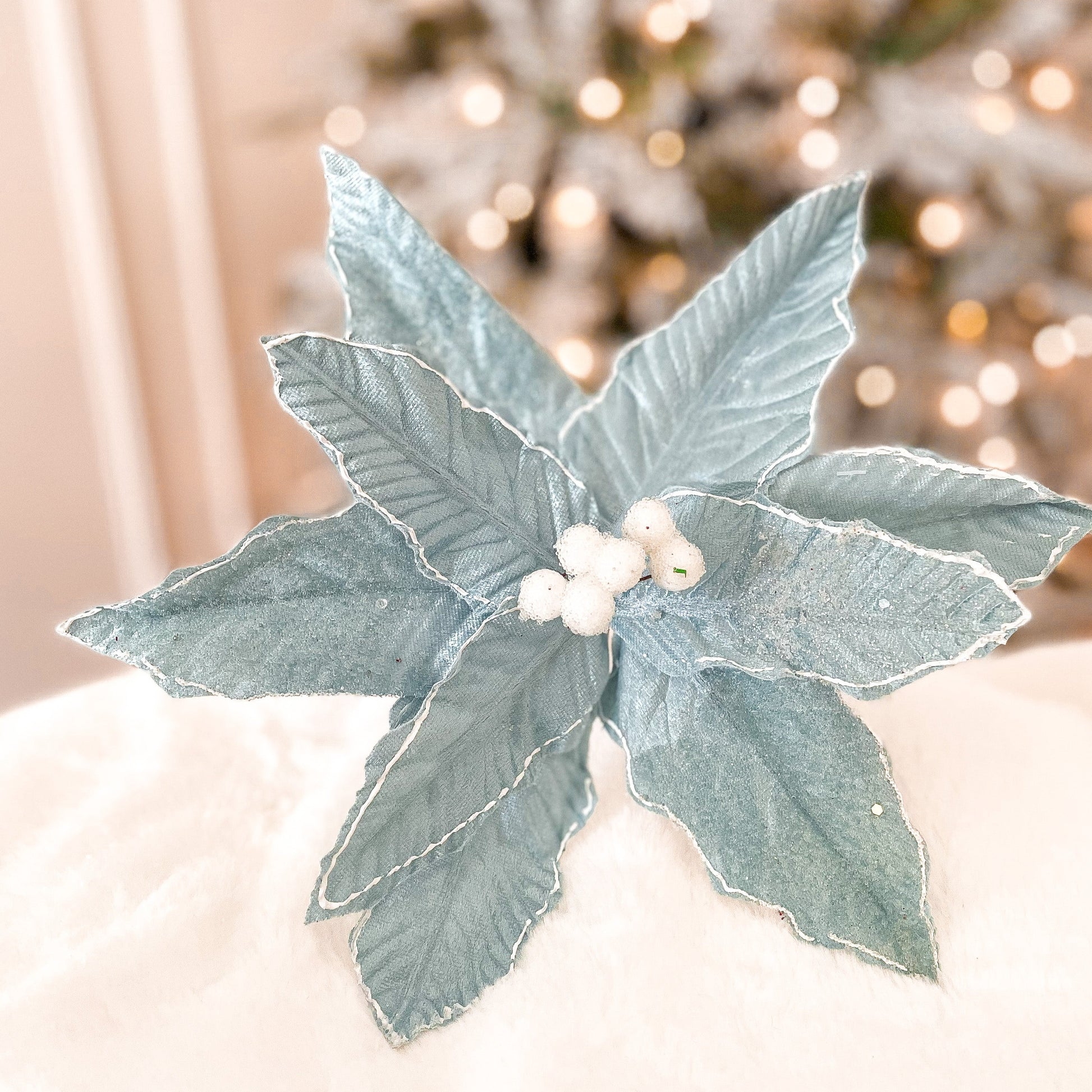 Embrace the spirit of the season with our Icy Blue Christmas Poinsettia Floral, a stunning representation of the holiday's enchantment. This exquisite piece combines the timeless elegance of poinsettias with a cool and refreshing icy blue hue, evoking the serene magic of a winter wonderland. The perfect addition to any Christmas winter wonderland themed tree.