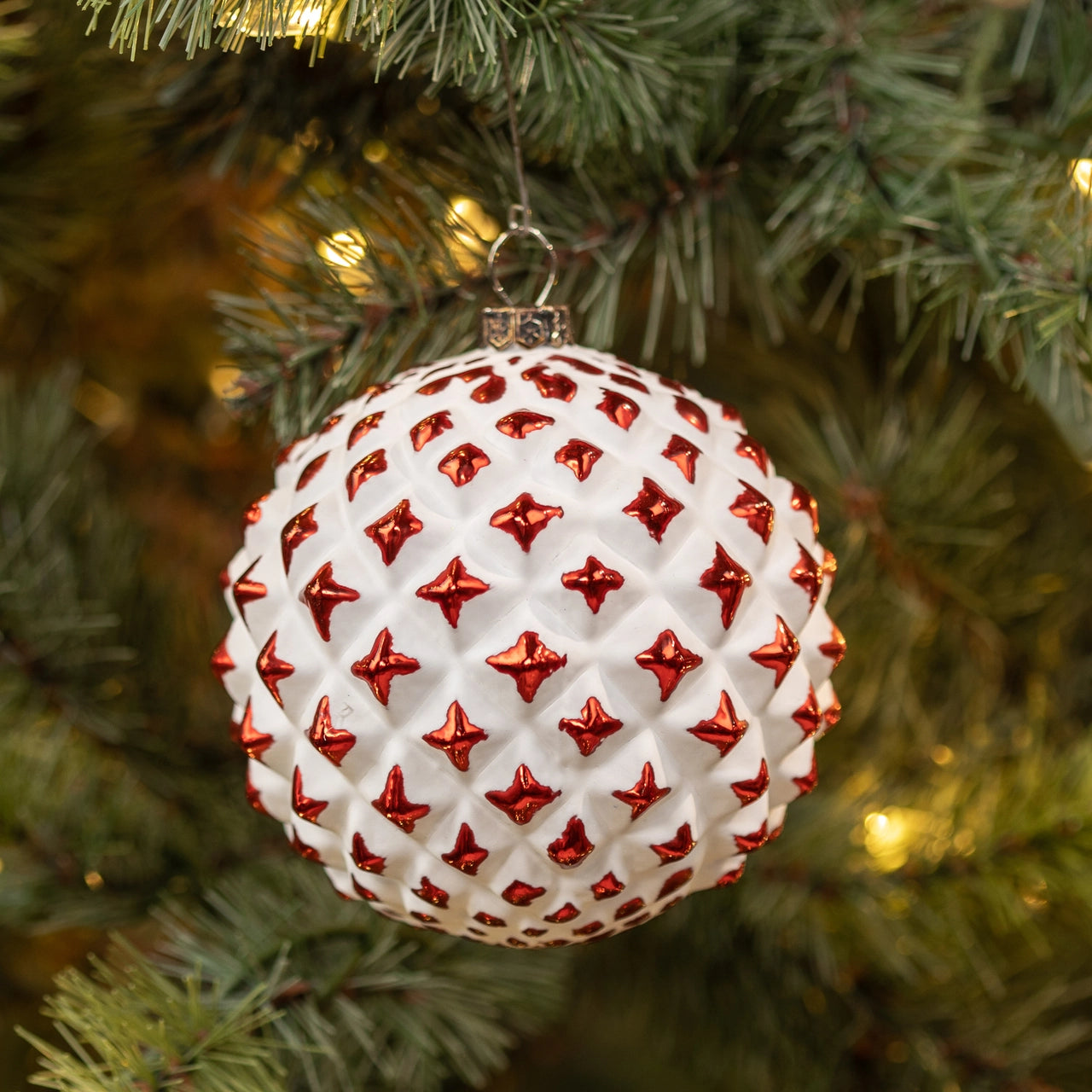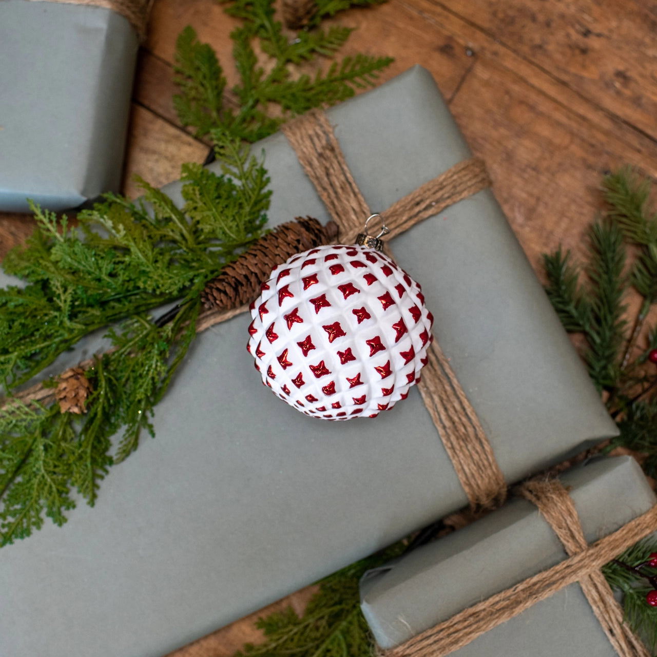 Transform your Christmas tree into a masterpiece of holiday elegance with our White & Red Textured Ball Ornament. This exquisite ornament seamlessly blends classic white and festive red in a textured design, adding a touch of timeless charm to your festive decor.
